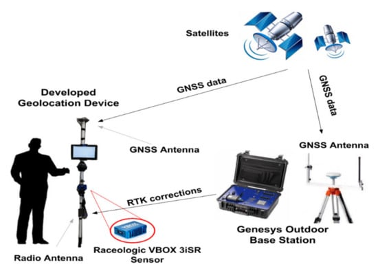 This sub-section describes the geolocation device architecture in detail; Figure 6 shows a scheme with all the employed instruments along with necessary connections. As the user on the proving ground must hold it, its structure is light as possible to guarantee manageability and easy transportation. The chosen structure is a vertical pole with all the necessary elements fixed on it. The device’s position must be real-time geolocated with high precision, and therefore, the VBOX 3iSR INS was used; the latter combines measurements from the GNSS receiver (100 Hz RTK GPS/GLONASS) and wheel speed with those provided by the Inertial Measurement Unit (IMU) to accurately determine the position, speed, acceleration, attitude, and angular velocity of a vehicle [17]. VBOX 3iSR INS can also work as a GNSS-only mode (satellite receiver) by disabling the IMU and wheel speed data. All the tests shown in this paper were carried out with GNSS-only mode.