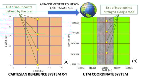Set of points defined by user in a generic Cartesian reference system with origin x = 0, y = 0 (a); through a specific Matlab tool, the input points are arranged on the UTM coordinate system (b).