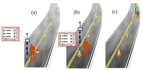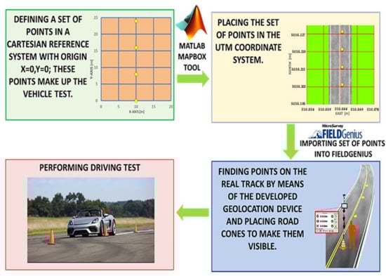 An innovative sensor-based system for preparing car tests on a track was designed in this scientific work. Automotive standards rule the points’ configuration and their relative position to verify under-test vehicle performance, such as road-holding or the proper operation of onboard systems, such as the electronic stability control (ESC) [40]. Preparing vehicle tests with traditional instruments (e.g., metric wheels) takes a long time, since operators place road cones (more than 100 m away) through inaccurate distance and angular measures [41,42]. They must also make perfectly straight lines, rarely realizable when using the metric wheel.