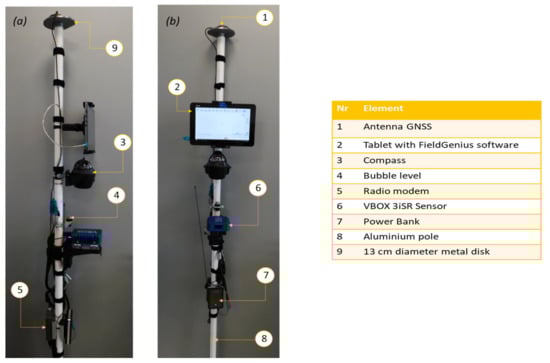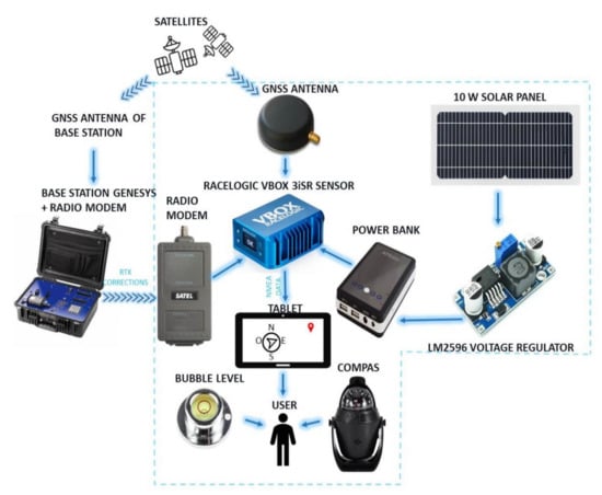 The VBOX 3iSR INS is connected to an external GNSS antenna placed on the pole top to have a better satellite view. Since the GNSS antenna position does not lie on the ground, it is crucial to keep the pole vertical during operations so that the antenna center horizontal coordinates coincide with those of the pole end in contact with the ground. For this aim, the device is equipped with a bubble level to correctly place the pole while fixing a point on the ground. A power bank feeds the VBOX 3iSR INS, which supports a supply voltage in the range 6.5–30 V (the supplier recommends 12 V); VBOX 3iSR INS, in turn, powers both the radio modem and GNSS antenna. Since the user needs to know the cardinal directions, a compass was included. The tablet is connected to VBOX 3iSR INS through a custom cable. The used elements are described as follows: