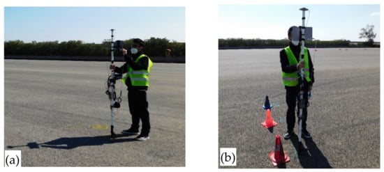 The first configuration was a grid of 4 × 4 points, 5 m away from each other in the vertical and horizontal directions; it was chosen to determine the introduced error on the relative distance between the points due to the high number of close points, making it easier to measure the distances by the Leica sensor. The 4 × 4 point grid was set up on the road platform by following the operative procedure described in Section 2; it was initially defined on a Cartesian reference system (Figure 16a) and then placed on the Mapbox satellite map after defining the origin and y-axis orientation (Figure 16b). Next, the Mapbox tool output file containing the grid points in UTM coordinates was uploaded into the FieldGenius software on the tablet. Finally, the 16 points of the grid were physically and quickly located by the operator on the road platform through the FieldGenius instructions related to cardinal directions (as depicted in Figure 5). Once each point was fixed, it was marked on the road, and a lying cone was placed to perform the distance measurement by the Leica 3D Disto sensor (Figure 17a,b).