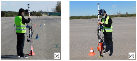 Both the compass and bubble level have been positioned to be visible to the user when standing. Figure 8 shows the stake-out geolocation device with its components numbered; Figure 9 shows its use on the track. In Figure 9a, the user selects on the FieldGenius software the points to be staked out; then, they move toward the target points by following indications provided by the software and compass (Figure 9b); in Figure 9c, the operator quickly locates the points on the track’s large space with centimeter accuracy and places the road cones on them. In Figure 9d, the user uses the geolocation device to acquire and save the point coordinates previously marked on the ground.