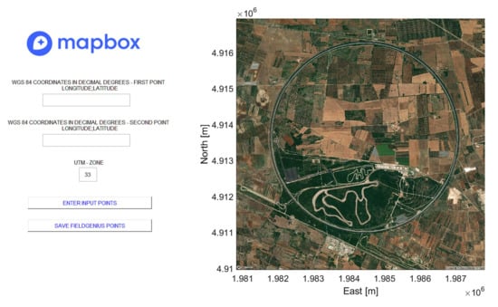 On the right side of Matlab Mapbox interface (Figure 10), there is the navigable map; on the left, there are three boxes to insert the longitude and latitude values of two chosen points (at least 7 decimal digits), and the UTM zone value (e.g., 33 for the Porche Technical Center location). Finally, by pressing the “ENTER INPUT POINTS” button, the user can choose the text file where the coordinate values of all the input points are stored.