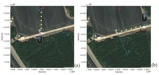 Using the Matlab Mapbox tool, the user can fix, by left-clicking in a geographic point on the map, the Cartesian reference system origin (Figure 11a); then, by right-clicking on a second point, the user defines the y-axis orientation of the Cartesian reference system (Figure 11b) as the line direction passing through two chosen points.
