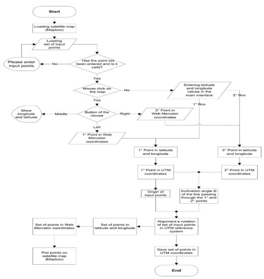 The Matlab Mapbox tool flowchart is shown in Figure 12. If the origin and y-axis are set on the Mapbox satellite map, the two chosen points are defined on the Web Mercator coordinate system; then, they are transformed in geodetic coordinates (latitude and longitude) by the inverse formulas for the spherical Mercator projection [29] and converted in UTM-WGS 84 coordinates by transverse projection formulas [29,30]. Next, the points loaded by the user are aligned considering the origin UTM coordinates (first point) and rotated by an angle θ formed by the grid north direction with the line passing through the two chosen points (y-axis in Figure 11b) in the UTM coordinate system. Afterwards, the input points are imported into FieldGenius by uploading the text file with the UTM coordinate values. During on-field operation, the VBOX 3iSR INS outputs an NMEA data stream containing the latitude and longitude (WGS 84) values of the GNSS antenna current position converted by FieldGenius in UTM coordinates by transverse Mercator projection formula. The latter allows us to compare the coordinates of stake-out device position with those of the target points performing FieldGenius’s operation mode to guide the user. The transverse Mercator projection alters the relative distances between points but not the shapes; the scale error within each UTM projection zone is under 0.1% [31]. This error could be unacceptable compared to the test standards for configuration involving large distances (i.e., greater than 100m).
