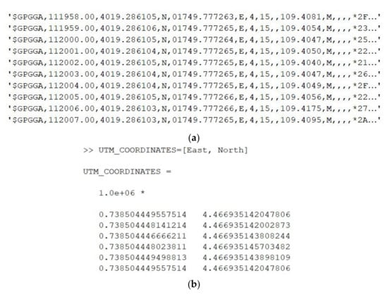 NMEA messages acquired by the VBOX sensor, filtered by the developed Matlab script (a), and converted into UTM coordinate (b).