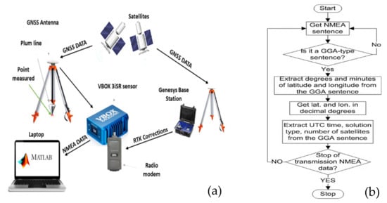 Experimental setup to detect the position of the measuring point by the VBOX 3iSR INS (a); flowchart of the developed Matlab code to process the NMEA data stream (b).