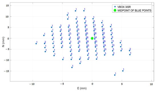 Figure 15 shows the graph of performed measurements expressed in relative UTM coordinates with respect to the midpoint; next to each point, the number represents the total readings with the same coordinates. Table 1 reports the UTM coordinates of the calculated midpoint (in Figure 15 the green symbol) and the standard deviation in east and north directions related to the performed measurements.