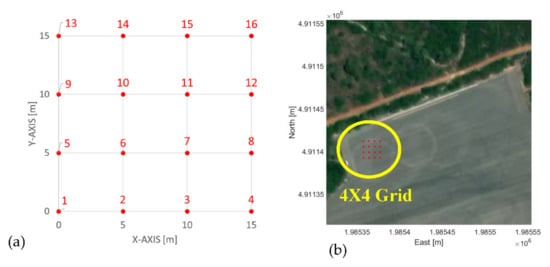 A 4 × 4 point grid defined in a Cartesian reference system (a); the same point grid defined in the Web Mercator coordinate system on the Mapbox satellite map of developed Matlab tool (b).
