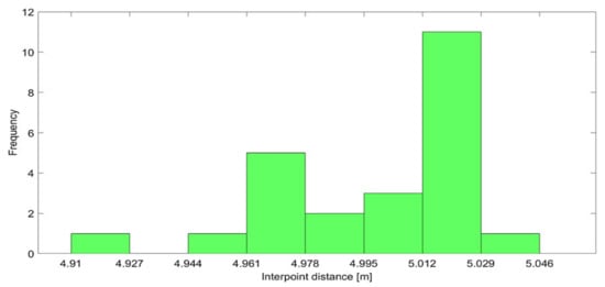 Further analyses were made on the measured distances between two successive points of the grid, which had both horizontal and vertical distances always equal to 5 m (Figure 16a). Figure 18 shows the distances’ distribution between two successive grid points, considering all possible combinations, and grouped into seven bins of equal width. The average error with respect to 5 m nominal distance was 2.4 cm, the standard deviation 1.7 cm, and the average percentage error 0.47%.