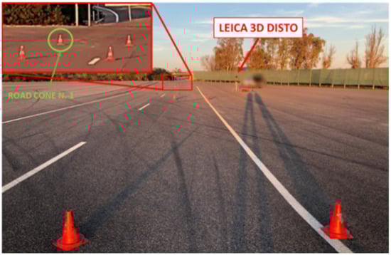 Arrangement of road cones on the staked-out points related to vehicle test ruled by the ISO 3888-1 standard and position of the Leica 3D Disto sensor used to measure relative distances.