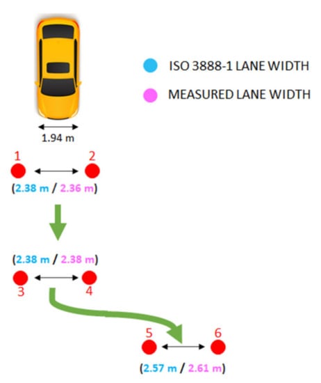 By the same measuring procedure using the Leica 3D Disto sensor, we performed the distance and angular measures with regards to the staked points; the obtained mean and maximum values are reported in Table 3. The angular error was much lower than the grid error (reduction factor 5), mainly due to higher distances of the double lane-change maneuver configuration. To verify the lanes width error, Figure 21 reports the comparison between the ISO 3888-1 standard lane widths and those measured; the maximum error was 4 cm, an acceptable value according to the reference standard.