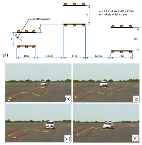 ISO 3888-2 lane-change maneuver with the lane widths depending on the vehicle width (a); sequential shots (b–e) of a vehicle performing test ruled by the above standard configuration, defined on the track by the stake-out system.