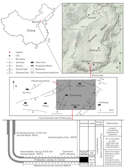 - Zhu, S.; Salmachi, A.; Du, Z. Two phase rate-transient analysis of a hydraulically fractured coal seam gas well: A case study from the Ordos Basin, China. Int. J. Coal Geol. 2018, 195, 47–60. [Google Scholar] [CrossRef]