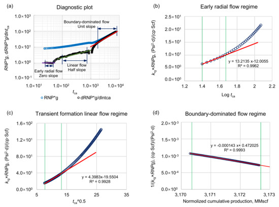 - For early radial flow regime, the average water saturation in the AI can be approximated using Equation (5) and the geometric-average permeability is calculated using the slope of krg × RNPg versus logtca (or superposition time tca,rsp, see Appendix B).