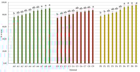 For example, A0—apple branches not subjected to thermal processing; C1—cherry branches pyrolized at 400 °C and 5 min; P9—cherry branches pyrolized at 500 °C and 15 min.