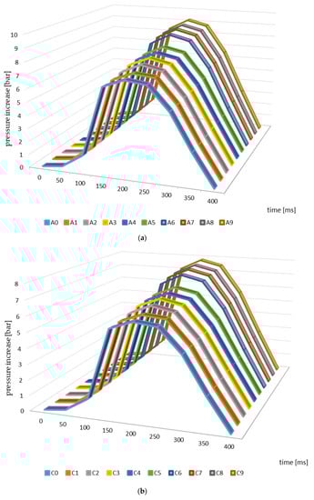 Figure 3 presents the changes in explosion pressure relative to material and time. Similar trends in the changes of this parameter were observed in the case of all of the materials investigated, which resulted from the differences in the parameters of the pyrolysis process and from the higher temperatures in particular. The maximum explosion pressure was observed 200 ms after the initiation of the explosion in the case of the materials from apple, cherry, and pear branches not subjected to thermal processing (Figure 3). The maximum values of this parameter relating to the other materials (biochars) were identified at the same timepoints during the analysis.