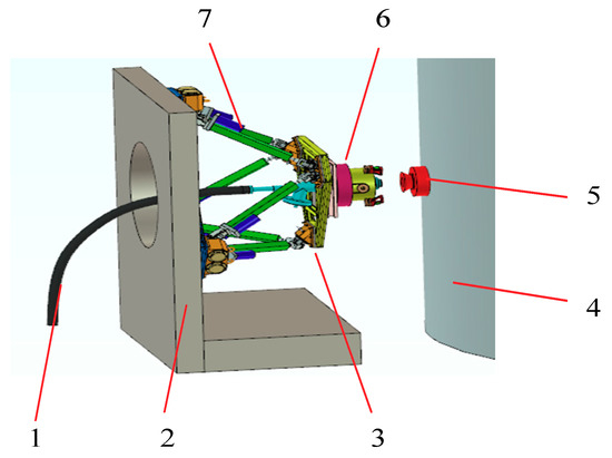 The schematic diagram of the automated umbilical system is shown in Figure 1. The fixed platform of the parallel mechanism is connected to the launch tower or the service arm, and the connector and hydraulic pipeline are driven by the movable platform to dock and connect with the propellant filling port of the rocket. Due to external influences that can cause the launch vehicle to swing randomly [11], the automated umbilical system employs machine vision to locate the rocket, and employs an adaptive impedance controller to achieve a stable and safe contact with the rocket to avoid damage to the system.