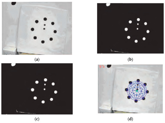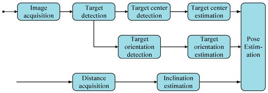 As shown in Figure 3, the image acquisition module first collects the target video image input by the camera in real time and the target detection module quickly confirms the distance of the target by pattern matching; then the target center detection and orientation modules calculate the position and orientation of the target by image segmentation and target tracking according to the distance of the target; the target center estimation module calculates the target center’s position by bundle adjustment according to the location of the target element; the target orientation estimation module will calculate the main direction of the target according to the position of the direction element and outputs the rotation angle [13,14].