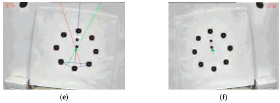Image analysis results: (a) original image, (b) binary image, (c) target recognition, (d) target center detection, (e) target center estimation, (f) target orientation estimation.