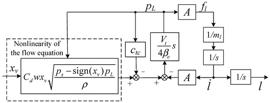 According to Equations (19)–(21), the nonlinear model of the electrohydraulic servo system is represented as the block diagram shown in Figure 6. The nonlinear part mainly considers the nonlinear influence of the servo valve flow equation.