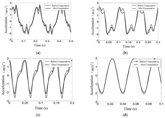 Effect of nonlinear compensation control: (a) 5 Hz, (b) 10 Hz, (c) 20 Hz, (d) 30 Hz.
