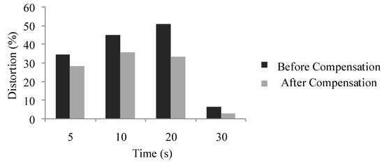 Because of the effect of servo valve nonlinearity, the hydraulic system has a large signal tracking error for acceleration. As shown in Figure 8, the hydraulic system tracks sinusoidal signals with frequencies of 5, 10, 20, and 30 Hz, and the tracking curves of acceleration are compared. From Figure 9, it can be seen that the nonlinear compensation can effectively reduce the tracking distortion of the hydraulic system for the acceleration signal. Furthermore, as the signal frequency increases, the compensation effect is more obvious.
