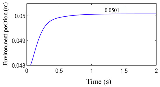 The simulation conditions are set to consider only the environmental stiffness in which the actual stiffness of the simulation environment is N/m, the actual position is xe = 0.05 m, and the desired contact force is fr = 10 N. The environmental parameters are initially estimated to be m and N/m, and the two controller parameters are and ; the results are shown in Figure 14.