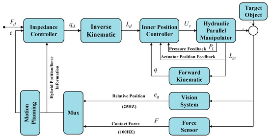 As shown in Figure 17, the entire control system consists of a position-controlled inner loop and force-controlled outer loop, wherein the inner loop is designed to ensure the system accuracy and rapidity of the system to track a specific movement with a high sample rate (500 Hz) linear variable differential transformer (LVDT); the outer control loop computes an appropriate trajectory to approach the target object based on the fusion of 6-dof force sensor (100 Hz) and vision sensor (25 Hz).