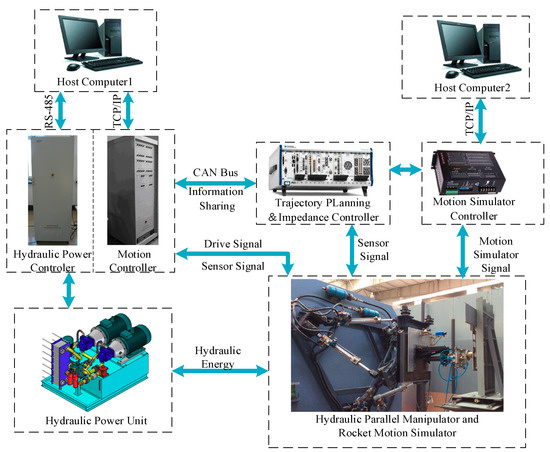 The overall experiment system includes two subsystems as shown in Figure 18. One part consists of the hydraulic parallel manipulator and the system controller, which includes a hydraulic power manager and motion controller. The other part of the rocket simulation system includes the motion simulator controller and rocket motion simulator. The rocket motion simulator is used to move the target object along x–y–z, the three orthogonal directions of Cartesian coordinate, in order to simulate the rocket’s realistic motion in the environment, and the simulator manager PC2 is employed to control the docking device to realize tracking, locking, unlocking, and other tasks with the pose information acquired from the vision sensor.