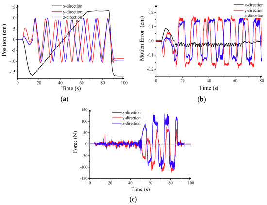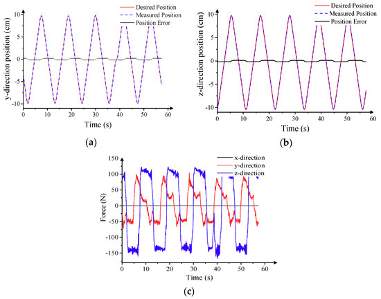 The target’s motion simulator is driven by a stepper motor for triangular wave motion, the amplitude of the triangular wave is ±100 mm, and the moving speed is 100 mm/s in y direction and 80 mm/s in z direction. At the beginning of the experiment, the parallel manipulator was located in its initial position and the midpoint of the triangular wave was x = 0, y = 0, z = 120 mm. The experimental data are shown in Figure 19. Figure 19a,b illustrates the dynamic position tracking data, including the desire and measured position in the x and y direction; Figure 19c illustrates the inertial force caused by the manipulator movement measured by a force sensor plate mounted on the end effector.