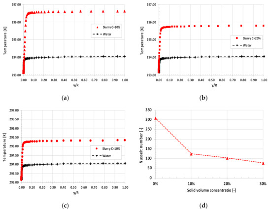 - For the same bulk velocity of the slurry, the Nusselt number decreases with solid volume concentration increase. The highest rate of decrease in the Nusselt number seems to be when 0 < C < 10%.