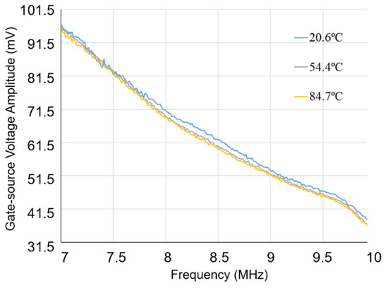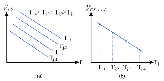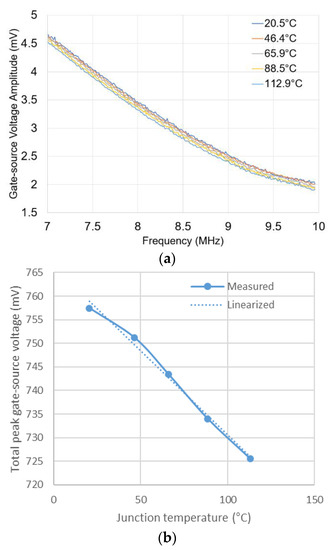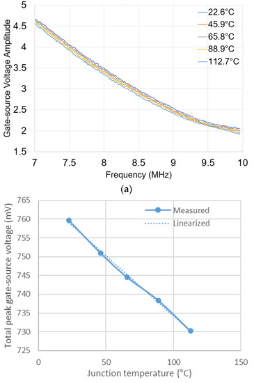 Figure 3 shows the principle of the proposed method schematically. The signal trends (used here for illustration) are in agreement with the experimental data presented in Section 4 and Section 5. Figure 3a clearly demonstrates that is a linear function of the chirp frequency, . Additionally, it is evident that is a monotone increasing function of as it is influenced by , which is the only temperature dependent parameter in the gate-source link. Therefore, increases across all frequencies with increasing as shown in Figure 3a. However, the variation of due to changes in are practically small and can be reduced by averaging over the sweeping frequencies for each junction temperature. This results in an improved estimate of for each . The total gate-source voltage amplitude can be calculated as:
