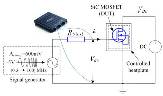 To demonstrate the method described in Section 3, a CREE/Wolfspeed MOSFET was mounted on a voltage-controlled heat plate and connected as shown in Figure 4. The SiC MOSFET was biased using a TopCon Quadro programmable DC power supply. The power supply can produce a constant DC voltage of up to . The low-amplitude, high-frequency, linear chirp signal was generated by Tektronix AFG3102 function generator able to inject between to with a signal sweep period of . The amplitude of the chirp signal is . The signal generator was able to produce an offset of V to ensure that the MOSFET is off during the injection period and the signal generator was set sweeping from 7 MHz to 10 MHz, which is below the 29 MHz resonant frequency. The DC blocking voltage was set to 300 V. The gate-source voltage was captured with the PicoScope 2204A-D2 from Pico Technology.