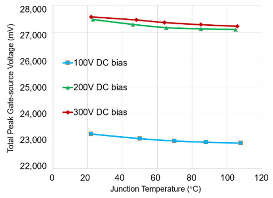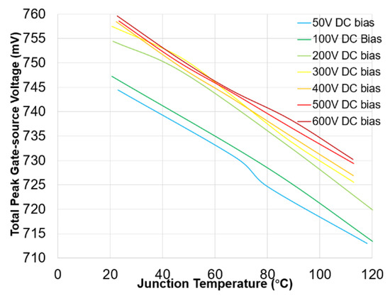 Due to the higher injected chirp peak-to-peak voltage of 2 V, values are higher compared to the values during the laboratory experiment, which was conducted at 600 mV. For example, at 9 MHz is 52.5 mV (20.6 °C) (2 V chirp signal) compared to the 2.5 mV at 20.5 °C (600 mV chirp signal). The larger values have a significant impact on the sensitivity of . At 300 V, the sensitivity is using a 2 V chirp signal compared to using 600 mV. Thus, chirp signals with higher amplitudes provide better sensitivity. However, the amplitude should not be too high; otherwise the SiC MOSFET could accidentally turn on. Figure 13 shows that similar to the laboratory scenario, exhibits a linear trend across the junction temperature while it shows a shift in the y-axis direction when the DC bias voltage changes.