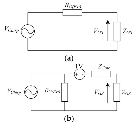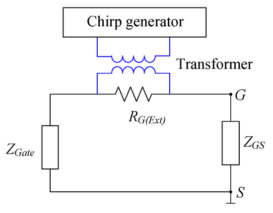 The previous section demonstrated the proposed TSEP in operation, where the chirp signal feeds directly into the gate. This is useful in the laboratory, where SiC MOSFETs are not connected into a converter or in the manufacturing line of power devices (e.g., end of line testing of SiC MOSFET modules). However, once the SiC MOSFET is integrated into a power converter, a chirp signal cannot be directly injected into the gate. This is because commercially available MOSFET gate drivers are unable to produce any AC signals as they are limited to switch between a constant high signal e.g., 20 V and low signal e.g., V. Therefore, the conventional gate driver must be modified so that chirp signals are superimposed during the negative gate voltage when the device is off. The principal circuit to achieve this is shown in Figure 8. In parallel to the external gate resistor, , a high-frequency transformer is attached to connect the chirp generator with the gate driver circuit. The injected chirp voltage, therefore, applies across and the in-series connected gate-source input impedance of the SiC MOSFET, , and the output impedance of the gate driver circuit . Figure 9 compares how is applied with and without the gate driver circuit. As shown in Figure 9a, which is the case without a gate driver (laboratory environment), is applied across and , and is measured across . Thus, using the voltage divider is obtained as:
