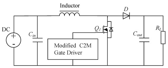 The Cree/Wolfspeed SiC MOSFET and the C2MTM modified Cree gate driver board are embedded in the Cree/Wolfspeed 8020-CRD-8FF1217P-1 boost DC/DC converter evaluation board [33]. Figure 10 shows the schematic of the boost converter and Figure 11 shows the experimental setup.