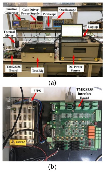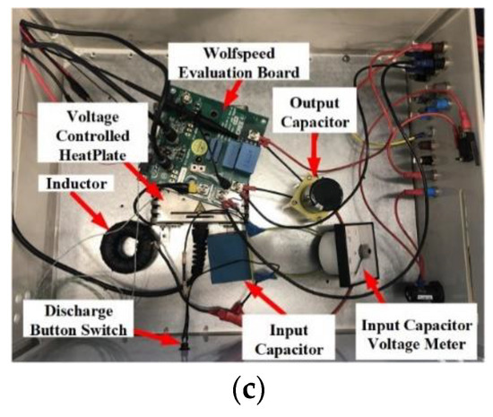 The overall test bench is presented in Figure 11a. The output of the boost converter is connected to a variable resistive load. The PWM signal is generated and controlled by using an interface board developed based on the TMS28335 DSP board as shown in Figure 11b and is sent to the Cree/Wolfspeed gate driver that forms part of the boost converter evaluation board. The SiC MOSFET is placed under the evaluation board and on a voltage-controlled heat plate (Figure 11c). The MOSFET was isolated from the heat plate with a silicon thermal pad. The heat plate has a resolution of 1 °C. The output load of the DC/DC converter can be changed between 30 and 300 Ω.