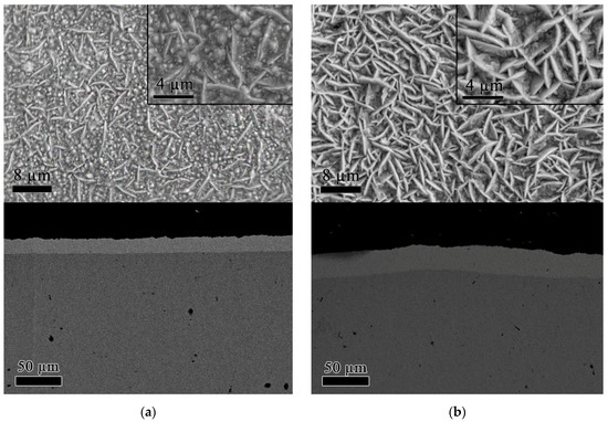 Figure 1 shows the SEM images of surface morphology and cross sections of Co/SiO2 composite coatings, formed under the effect of X-rays, and the reference sample formed from electrolytes with SiO2 concentration of 0.5 g/dm3. As shown in Figure 1a, the reference sample formed without irradiation is characterized by needle-shaped crystallites normally oriented to the substrate plane and by coarse and inhomogeneous grains oriented lengthwise (parallel) to the substrate plane. This structure is typical for a cobalt microstructure [24]. By contrast, a detailed examination of micrographs as seen in Figure 1b reveals that the irradiated samples differ from the geometry surface with crystalline grains only parallel directed to the substrate. The observed differences in the microstructure of irradiated and reference samples is caused by destruction of the primary structure of an electrolyte affected by X-rays and radiolysis transformations.