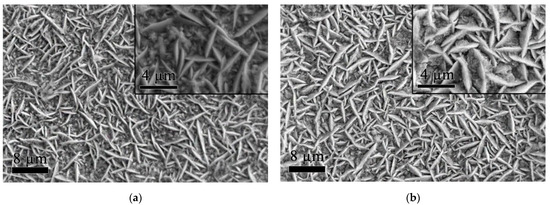 Based on a comparative analysis of Figure 2 and Figure 3, it is obvious that well visible normally oriented grains on the references samples gradually become smaller (Figure 3a) and are almost entirely eliminated on the surface of the irradiated Co/SiO2 coatings (Figure 3b). It should be noted that coatings demonstrated on Figure 2 were formed from an electrolyte with a SiO2 concentration of 1 g/dm3.