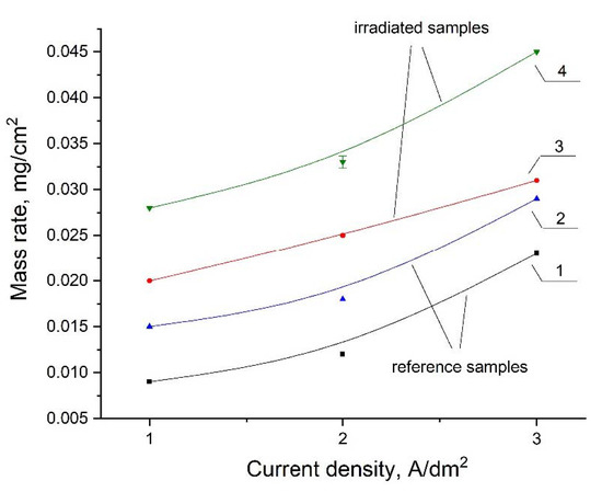 Mass rate in a unit area of the Co/SiO2 coatings formed at different current densities of 1–3 A/dm2: 1–reference sample, formed from electrolytes at 0.5 g/dm3 SiO2; 2–reference sample, formed from electrolytes at 1 g/dm3 SiO2; 3–irradiated sample, formed from electrolytes at 0.5 g/dm3 SiO2; 4–irradiated sample, formed from electrolytes at 1 g/dm3 SiO2.