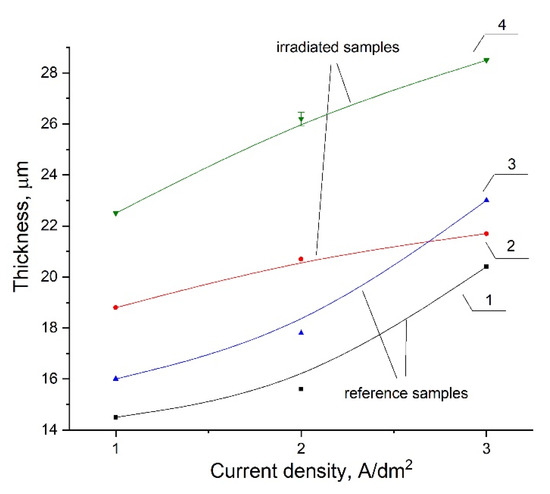 Thickness of Co/SiO2 formed at different current densities: 1–reference sample formed from electrolytes at 0.5 g/dm3 SiO2; 2–irradiated sample formed from electrolytes at 0.5 g/dm3 SiO2; 3–reference sample formed from electrolytes at 1 g/dm3 SiO2; 4–irradiated sample formed from electrolytes at 1 g/dm3 SiO2.