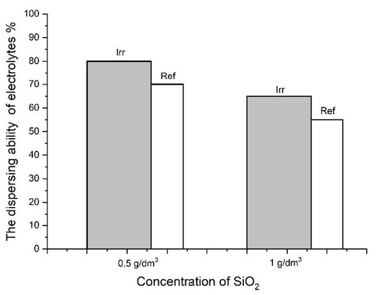 The dispersing ability of irradiated and nonirradiated electrolytes at 0.5 g/dm3 and 1 g/dm3 concentration of SiO2 nanoparticles.