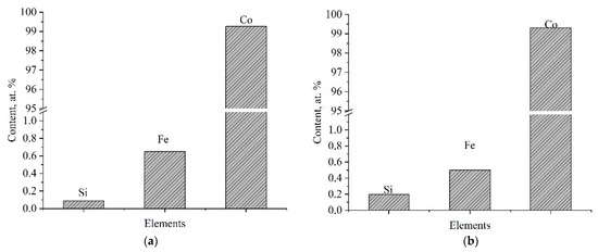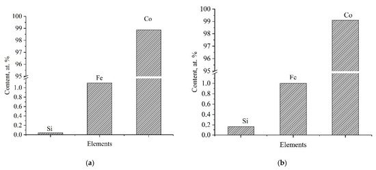 The obtained date can be explained by suggesting that the X-ray effect on the solution containing nanoparticles is the destruction of nanoparticles clusters due to an increase in the dispersing ability of electrolytes. The obtained data correlate with the study of the mass gain, thickness and dispersing ability. It is worth paying attention to the Fe content in the Co/SiO2. The Fe content in the coatings formed from electrolytes at 1 g/dm3 SiO2 (Figure 8) is less than in the deposits formed from electrolytes at 0.5 g/dm3 SiO2 (Figure 7). The reduction in Fe content can be caused by increasing the thickness and mass gain of the irradiated coatings. As for Fe content in the coatings, Fe can appear due to the preliminary reversal of a direct electric current in the 5 min period before the electroplating and some amount of Fe ions can be transferred to the solution after the reversal.