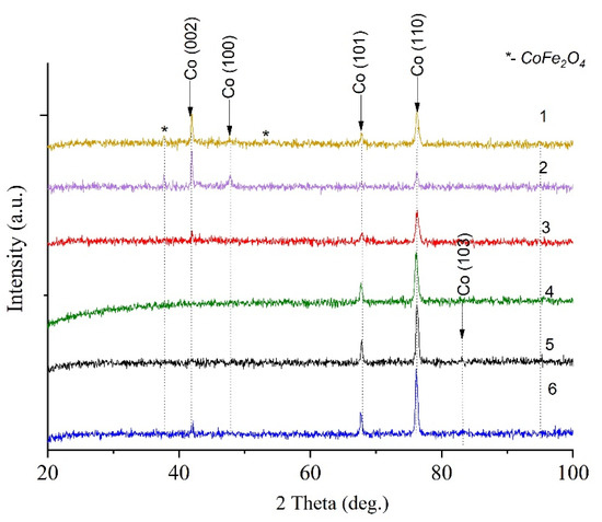 XRD patterns of CoSiO2 coatings deposited in X-rays: 1—reference Co-coating without SiO2, 2—Co-coating, formed under irradiation; 3—CoSiO2 deposited from the bath at 0.5 g/dm3 SiO2, 4—CoSiO2 deposited from the bath at 0.5 g/dm3 SiO2 in the X-ray, 5—CoSiO2 deposited from the bath at 1 g/dm3 SiO2, 6—CoSiO2 deposited from the bath at 1 g/dm3 SiO2 in the X-ray.
