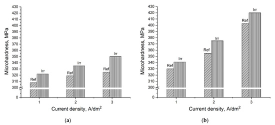 Microhardness of irradiated (Irr) and non-irradiated (Ref) Co/SiO2 formed at current densities of 1–3 A/dm2 from electrolyte with SiO2 nanoparticles of 0.5 g/dm3 (a) and 1 g/dm3 (b).