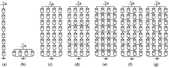 To help limit the mismatch and shading effects, the wiring pattern of the PV array has to be considered to identify architecture with sufficient redundancy. Several possible PV arrays’ interconnection schemes were reported early in the literature [7,8]. These include the Series (S); the Parallel (P); the Series–Parallel (SP); the Series–Parallel–Series (SPS); the Total-Cross-Tied (TCT); the Bridge-Linked (BL); and the Honey-Comb (HC) arrays, illustrated in Figure 1a–g, respectively. A simple S array can attain high output voltage at low output current while the P array can provide the highest output current, but only at the low output voltage. The S array is also referred to as the string, whereas the P array is the tier. Both S and P arrays have the simplest wiring. The SP array can output both a high voltage and high current, yet it has simple wiring. The SPS array is formed by connecting several short SP sub-arrays in series.