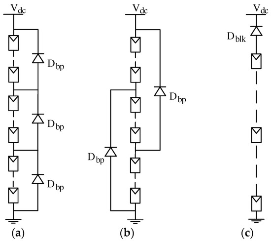 Diodes’ interconnections in PV modules: non-overlapping bypass diodes (a); overlapping bypass diodes (b); blocking diode connection (c).