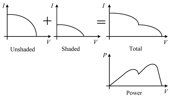 Commercial PV modules are usually composed of several sub-strings. The sub-string is usually configured as a short S or SP array of PV cells. To alleviate shading and mismatch problems, bypass diodes are connected across each sub-string, as shown in Figure 2. Typical connection patterns of the bypass diodes are the overlapped and the non-overlapped connections, as in Figure 2a,b, respectively [15]. In normal conditions, the bypass diode is reversed biased and does not conduct. When shadows are cast, the current output of the shaded sub-string falls below that of the adjacent sub-strings. The bypass diode across the weak (i.e., low current) sub-string conducts and allows the current of the productive sub-strings to detour the shaded one and flow through to the output. This strategy keeps the shaded module partially productive, but at the risk of hot-spot apparitions [16]. A prominent side effect of the bypass diodes is the appearance of multiple peaks in the power curve of the shaded PV module, as shown in Figure 3.
