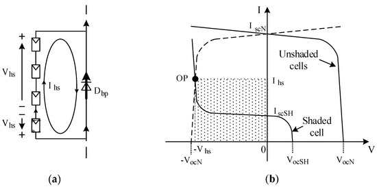 When a single cell of a certain sub-string becomes shaded, the associated bypass diode turns on to conduct the current of the neighboring substrings. However, the terminals of the shaded sub-string become “shorted” and a conductive path is established for the normally insolated cells of the “shorted” string to apply their voltage across the shaded cell and reverse bias it, as shown in Figure 5a. The operating point (OP) of the shaded cell is found at the intersection of its V–I curve and the mirror image of the combined V–I curve of the normally insolated cells (dashed), as illustrated in Figure 5b. This may cause an avalanche breakdown of the shaded cell. As the power dissipated in the shaded cell is quite significant, the shaded cell becomes thermally stressed. The heat is localized at the small area of the shaded cell and is referred to as the hot spot. The abnormal power dissipation may cause permanent thermal damage, cracking, or melting of the cell. A longer sub-string imposes higher reverse voltage and develops higher power at the hotspot. Therefore, bypassing shorter sub-strings prevents the breakdown, hotspot appearance, and damage [20].